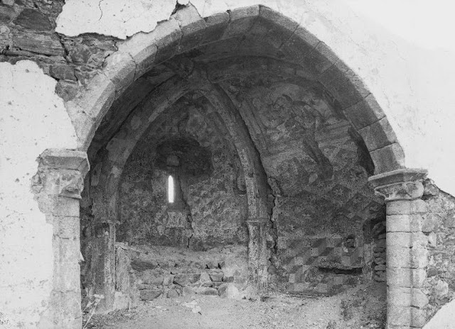 Aspecto interior, em ruína, da Ermida de Santo André do Outeiro, em Montemor-o-Novo. Esta imagem está publicada no Inventário Artístico de Túlio Espanca (Inventário Artístico de Portugal, Distrito de Évora - Zona Norte, vol.II, Lisboa, Academia Nacional de Belas Artes, 1975, est. 361).