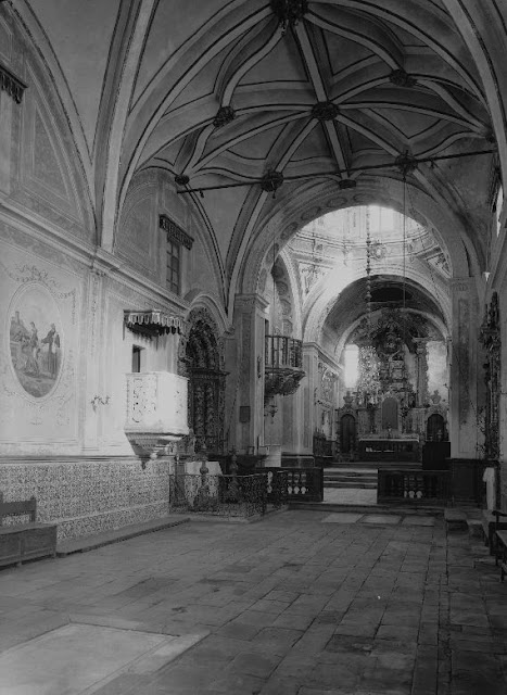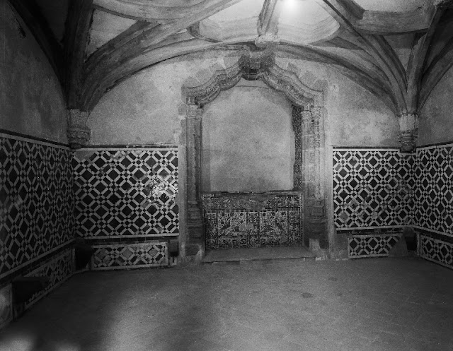 Aspecto parcial da Sala Capitular do Convento de São Francisco, em Montemor-o-Novo. Esta imagem foi publicada no Inventário Artístico de Portugal, de Túlio Espanca (Espanca, Túlio, Inventário Artístico de Portugal, Volume VIII, Distrito de Évora - Zona Norte, Lisboa, Academia Nacional de Belas Artes, 1975, est.56).