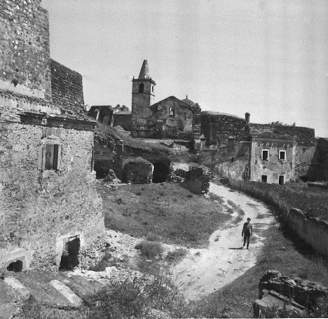 Vista do interior da Praça da Fortaleza de Juromenha: ruínas da Igreja da Misericórdia (à esquerda) e da Igreja Matriz de Nossa Senhora do Loreto (à direita).