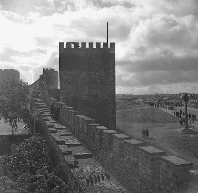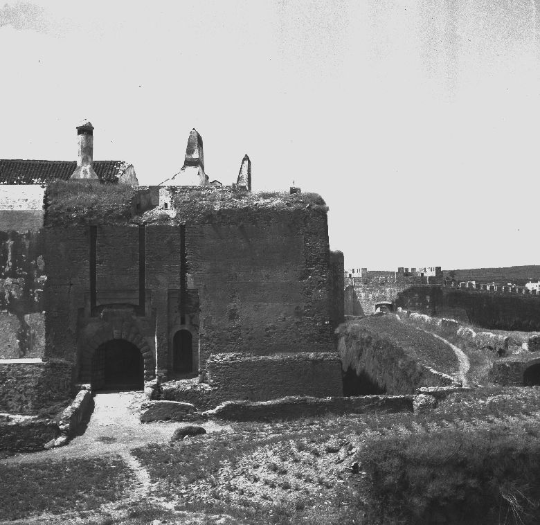 Castelo de Vila Viçosa: caminho de ronda, torres circulares e Torre de Menagem (?). Esta imagem está publicada no Inventário Artístico de Portugal de Túlio Espanca (Distrito de Évora, Zona Sul, Volume II)