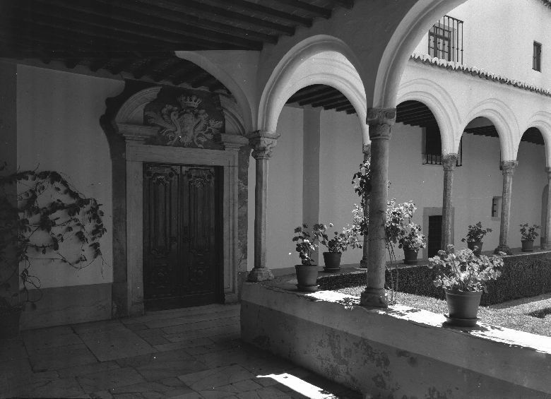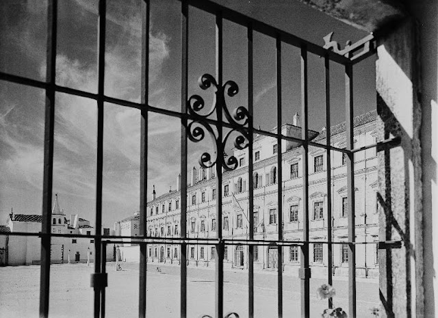 Claustrim manuelino e portada da capela Real da Colegiada de São Gerónimo, no Paço Ducal de Vila Viçosa (Paço dos Duques de Bragança). Esta imagem está publicada no Inventário Artístico de Portugal de Túlio Espanca (Distrito de Évora, Zona Sul, Volume II)